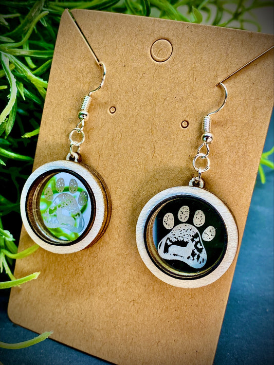 Corgi Paw Print Mirror and Wood Dangle Earrings