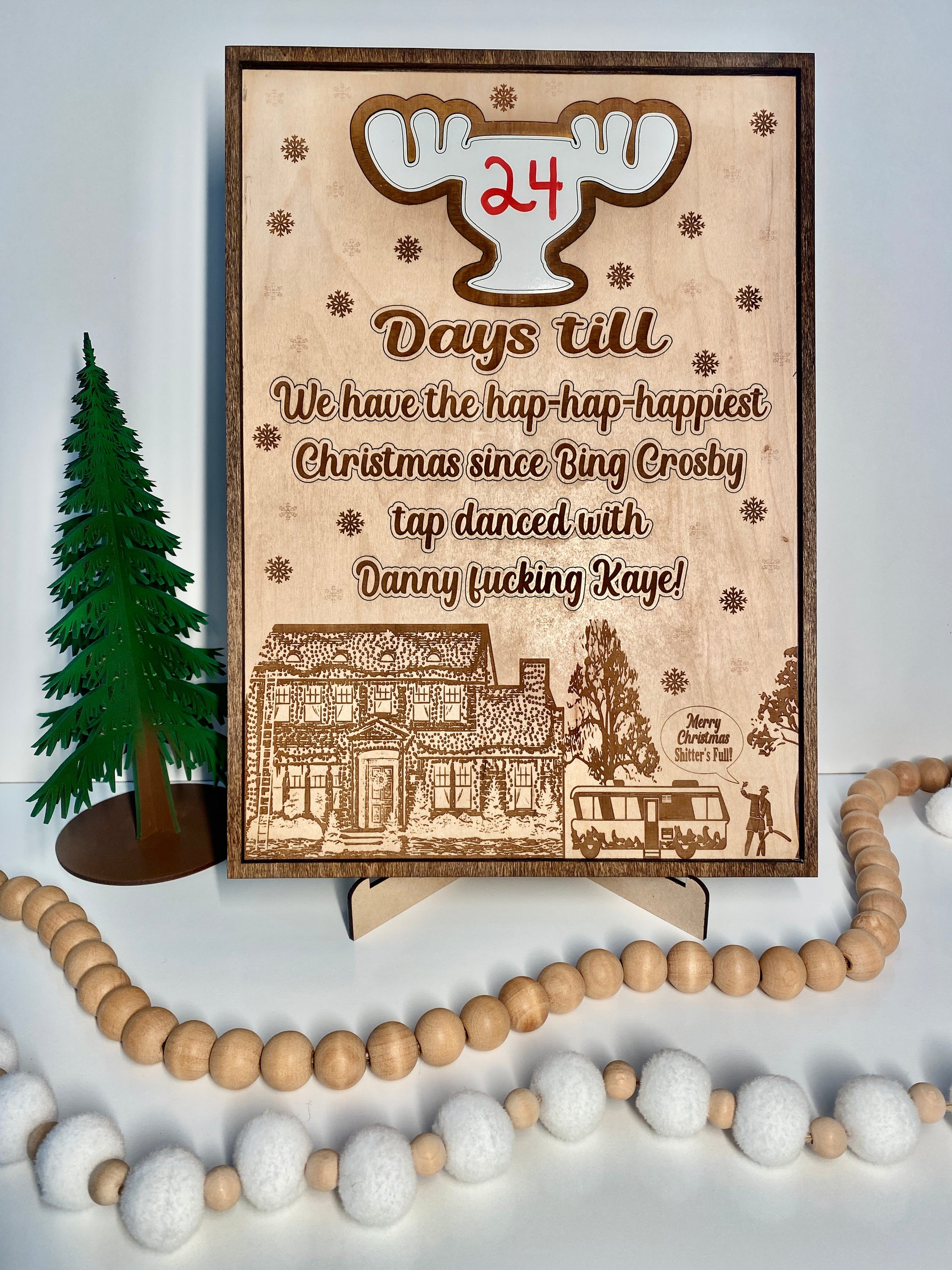 Countdown to Christmas the Griswold way! Made of dry erase whiteboard and engraved maple. Can be hung or placed on the included stand. Approx. 10” x 14”
