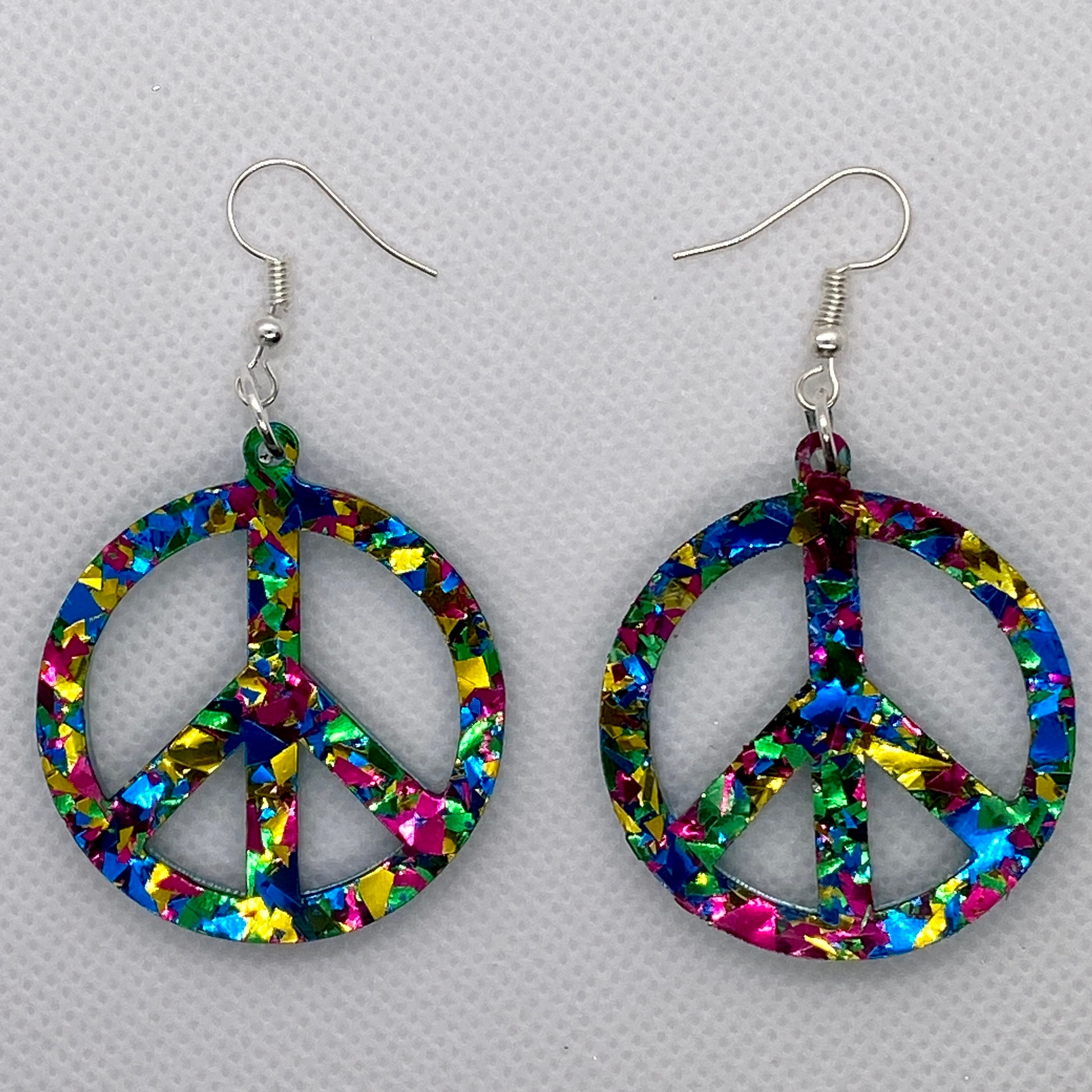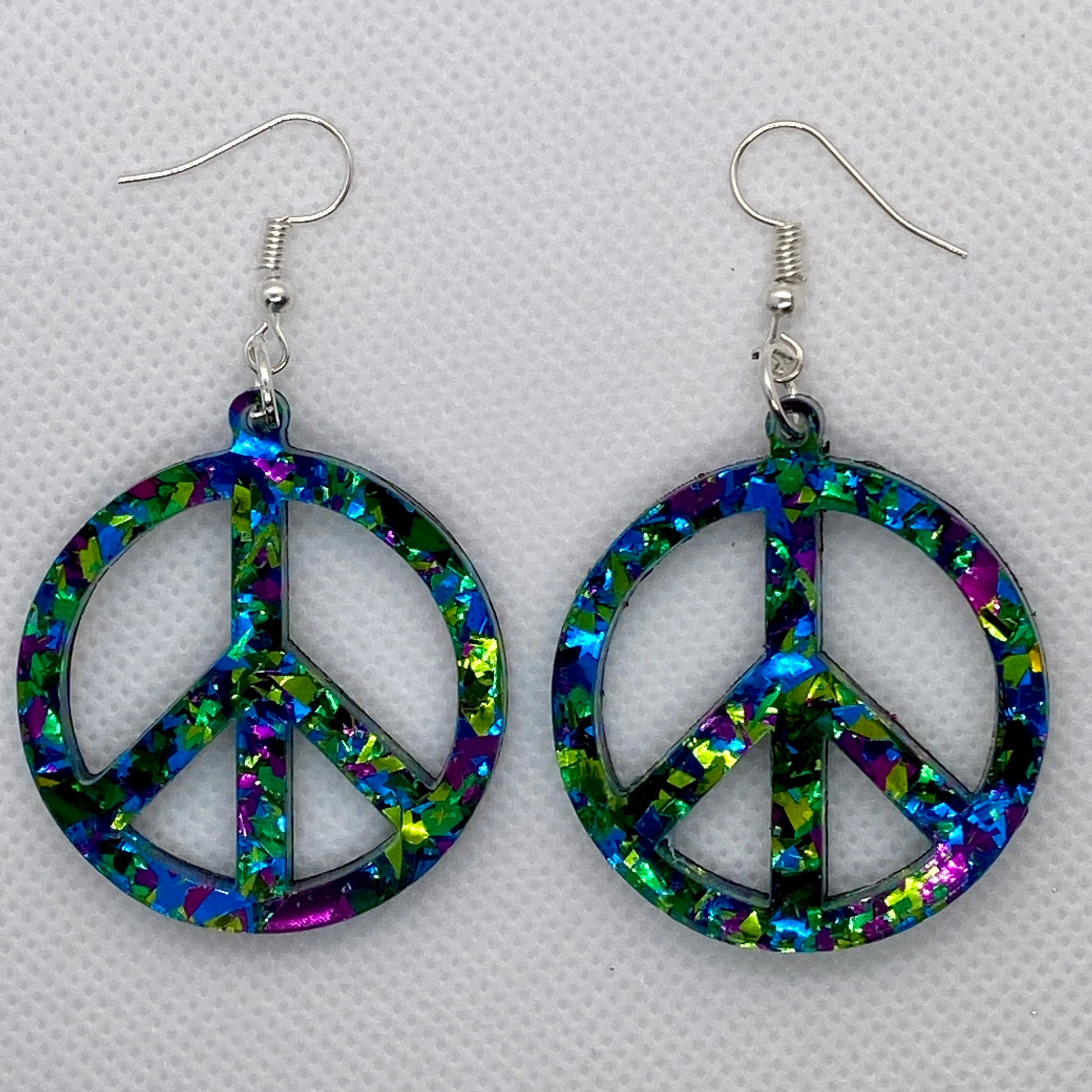 Reversible Peacock/Multicolor Acrylic Peace Sign Earrings